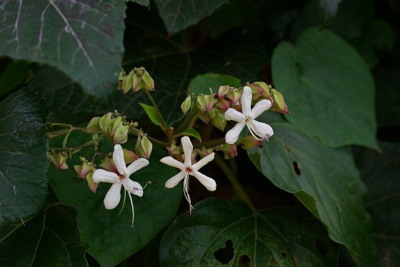 | 本州西部〜九州、琉球列島の低地〜山地に生える落葉低木。葉は対生し、卵形〜卵状披針形、粗い鋸歯縁があり、先端は尖る。両面とも無毛で光沢がある。 花序を頂生または腋生し、集散花序に多数の花を付ける。花冠は白色で、直径3センチほど、5裂し、平開する。芳香がある。 〜徒然想〜 陽当たりの良い駐車スペースの周りに沢山生えていました。 変な話ですが、車を降りたときには全くこの花に気が付きませんでした。モクビャッコウやアオガンピなど、海岸性の植物を観察して車に戻ってきたときに気付きました。 駐車スペースを囲むようにこんなに沢山咲いているのに・・・。 車を降りたとき、もう既に気持ちは観察場所に行っているのでしょうね。 本州でもみられるクサギに似ていますが、葉に光沢があること、厚みがあること、無毛であることなどから見分ける。 そういえば、アップ済みのクサギ(沖縄で撮影)もアマクサギかもしれません。 −同じ科の植物− |