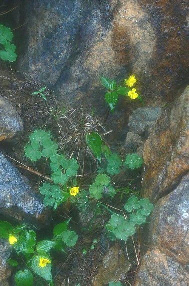 北海道の超塩基性岩地(アポイ岳、白鳥山など)にだけ生え、高さ5〜10センチ。葉は3輪生状に付き、細長い卵形、先は尾状に尖る。厚くて光沢があり、裏面は紫色を帯びる。 花は直径1.5〜2センチで、側弁の基部と花柱の上部に毛がある。花期は5〜6月。 〜徒然想〜 ポツポツ当たっていた雨が、エゾキスミレに出逢う頃にはすっかり雨になってしまいました。 雨具の陰からカメラを取り出し、傘をかざしての撮影です。姿のいいすみれだけに、きれいな姿をじっくり撮りたかったのですが、残念です! 雨に煙るエゾキスミレも趣があってきれいと強がりを言ったものの、その趣を画像に残せませんでした。 −同じ科の植物− |