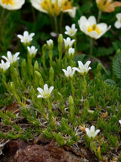 大雪山系の固有変種で、岩場や砂礫地に生える多年草、高さ3〜5センチほど。マット状に広がって群生する。 エゾタカネツメクサに比べて草丈が低く、葉はやや扁平で弓状に湾曲し、縁に毛が多く、3脈がある。 花は白色、径1センチほどで、花弁は5枚で倒卵形、先は裂けない。 〜徒然想〜 図鑑に載っているエゾミヤマツメクサの撮影地が大雪山系赤岳であること知っていたはずなのに、赤岳に行かなかったのが悔やまれます。 今日一日、近辺を歩き回って多くの花に出逢い、大雪の山々を満喫し、もう満腹状態だったというのが正直なところです。赤岳のエゾミヤマツメクサをすっかり忘れてしまっていました。 幸い、エゾタカネツメクサとはちょっと様子が違うと思って撮っておいたものがありました。間違っていましたら、ご指摘願います。大雪山系小泉岳での撮影です。 −同じ科の植物− |