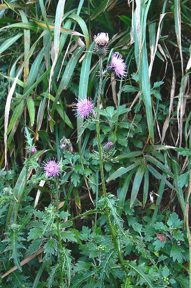 海岸近くの草地、荒地などに生える多年草で、高さは50〜120センチ。タイアザミの海岸型で、草丈はやや低く、葉は光沢があり、切れ込んだ葉の先端は鋭い刺となるのが特徴。