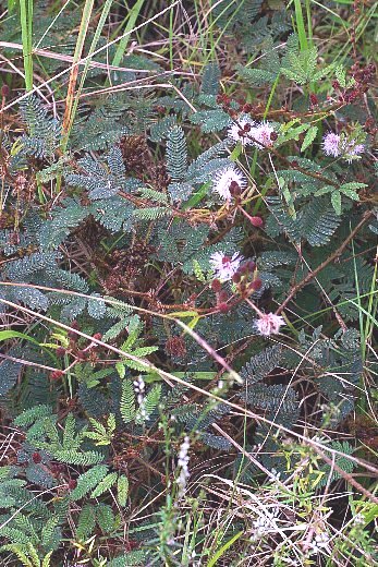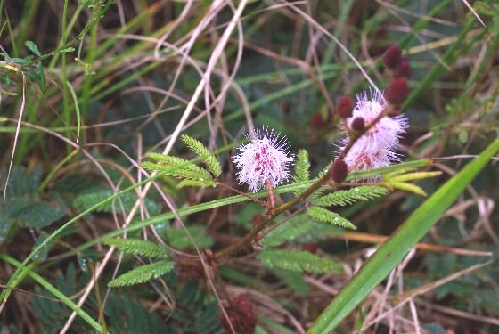 南アメリカ原産の多年草で、園芸的には1年草扱いにされている。茎はよく分枝し、長さ1メートルほどになる。葉は偶数2回羽状複葉からなる小葉が2〜4枚葉柄の先端に付く。 夜間や触れたりすると小葉が閉じて葉全体がやや垂れ下がる。 小さい紅紫色の花を、1センチほどの球状に付ける。 〜徒然想〜 さあ、これからリュウキュウツワブキやナガバハグマが咲く沢に下りようとした荒れ地に咲いていました。見つけたときに付けられた名前は“オジギソウの仲間”、まだ誰も名は分かりません。葉を突っついてみると葉は閉じ、確かにオジギソウの仲間です。 雨に濡れ、ボンボンのような花の形は崩れていますが、濃いめのピンクがきれいです。 図鑑などで調べてみると、これが正真正銘のオジギソウでした。 オジギソウの名は知っていて、触ると葉が閉じるのを喜んだ記憶があります。他愛ない、遙か昔の記憶です。 −同じ科の植物− |