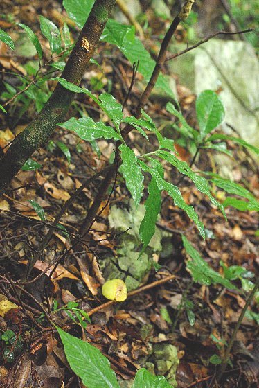 山地林下の石灰岩地などに生える多年草で、高さは15〜50センチ。葉は2〜3個付け、鳥足状に分裂する。小葉は11〜19枚で、狭楕円形〜楕円形。 雄株の花柄は10〜15センチで長く、雌株の花柄は3〜5センチで短い。仏炎苞は葉に遅れて開き、筒部は外側が紫緑色で白い縦筋があり、内側は通常白色。舷部は外側が紫緑色で、内面は紫褐色。付属体は棒状〜細棒状、上部が紫褐色でやや肥大する。花期は1〜3月。沖縄県に分布する。 〜徒然想〜 関東からの遠征組2人は、昼食の時間も惜しんで、先にスタートします。確かこの辺だったとの合図で、Kさんはどんどん林に入り込みます。 臆病な私は、恐る恐る身を引きながら、林の縁を探します。 そうです、ハブです。 森は薄暗く湿気があります。いかにもハブが潜んでいそうで、身がすくみます。 それでも、”ありました!”の声に、勇気を奮います。 残念ながら花は付けていませんでした。 当分は、尊敬する”野の花賛花”をみて、花を付けた姿を想像することになりそうです。 −同じ科の植物− |