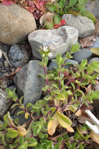 在来種のミミナグサと比べると、全体に軟毛と腺毛が多く、花柄は短く5ミリほどなので花が密集しています。茎はふつう赤みを帯びますが、緑のものもあります。