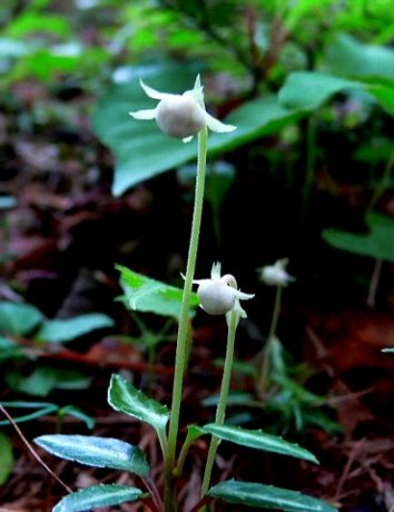 | やや乾燥した丘陵や山地の林内に生える多年草(又は小低木)で、高さ10〜15センチ。葉は2〜3個が輪生状に付き、長楕円形〜披針形で尖った鋸歯がある。 花は通常1個、稀に2個下向きに付ける。白い花弁は丸みを帯び、この形からウメの名が付く。花の直径1センチほど、5裂し、雄しべは10個もつ。花期は6〜7月。北海道〜九州に分布する。 〜徒然想〜 花は、初期は下を向き、次第に上を向くようになり、実になると、まっすぐ上向きになります。 3度目の正直。今度こそ顔を見せてくれるだろうか。過去2度は、うつむいた顔を持ち上げてみると、どの花ものっぺらぼう。あまりにものっぺりした白さに、むしろ不気味な想いがした。 居ました。やはり、恥ずかしそうに、花は下を向いている。恐る恐る顔を持ち上げてみると、・・・・・ようやく顔を見せてくれました。開いた花びらの奥に葯が除いています。それでも、写真を撮ろうとすると、嫌がるように下を向いてしまいます。 -同じ科の植物- |