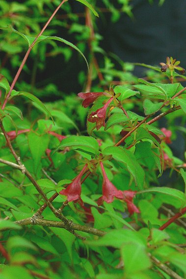 | ツクバネウツギの変種で、関東地方、中部地方の高地(標高1000〜2000m)に生える。花は濃赤色〜淡紅色で、下唇の内側に橙色の網状斑がある。 〜徒然想〜 ウグイスカグラかと思ったのですが、違ったようです。 高さは1メートルほど、腰の高さほどのところに、深い紅色の花を付けています。 往きに同じ道を通ったのに気づいていません。花探しではよくあることで、目的の花が先にあると思うと、途中の花には気付きません。この日の第一目的はクモイコザクラでした。 ウツギ類を整理していたときにこの植物の名を知り、見たいと思っていただけに、うれしい出逢いです。 −同じ科の植物− |
