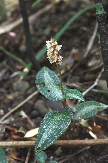 別名:ヤクシマシュスラン 山地の常緑広葉樹林下に生える常緑の多年草で、茎はほふくし、先は直立し、全長15〜30センチ。葉は4〜8葉を互生し、斜卵状長楕円形〜狭卵形で、葉の中央に帯状の白く太い筋斑が入る。 総状花序は頂生し、密に多数の花をつける。花は白色で淡紅色を帯びる。花期は9〜11月。 伊豆諸島の他に沖縄県内にも点々と産し、カゴメランと混生するが、個体数はより少ない。 〜徒然想〜 カゴメランの母種で、葉の中央部にぼやけた斑が入るか又は斑や編目模様がないもの(オオシマシュスランと呼ばれるそうです)があります。 沖縄では編目模様が明確なカゴメランのほか、模様の中央部が擦り消されたようなものが見られました。これならばハチジョウシュスランと呼んでいいでしょう、という程度です。 花は・・・・・・、まさに満開で、淡いピンクを帯び、こちらは筆紙に尽くせ難いほどの美しさです。 暗い森に灯るともしび、和みのともしびがありました。 −同じ科の植物− |