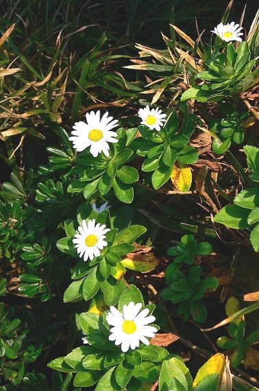 絶壁に咲く白く大きな花は、青い空や海に映え綺麗でした。海岸に至る小道では、コハマギクが咲いていました。