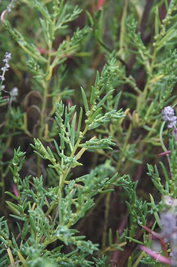 干潟や汽水域の河口などの泥土上に生える1年草で、高さは15〜35センチ。葉は互生し、肉質で、線形。秋には、葉が赤橙色に紅葉する。 花は枝の上部の葉腋に1〜5個集まって付き、花被片は5枚。花期は9〜11月。 〜徒然想〜 雑草のようであって、今まであまり気にしていなかった汽水域の植物ですが、マツナを探しに出て、この植物を意識するようになりました。 歩いた場所は河口付近で、以前趣味としていたクロダイ釣りのエサ場です。よくこういう泥地でエサになるマメガニというカニを捕ったものです。植物には、全く見向きもしなかった時期です。 足を踏み入れるたびに水がしみ出る地を歩きながら、今にもマメガニが逃げ込むような錯覚に陥りました。 この日はマツナもみつかり、両者を比較することができました。ハママツナはより背が低く、黄色く紅葉し、マツナはずっと大きく、赤色に紅葉します。 −同じ科の植物− |