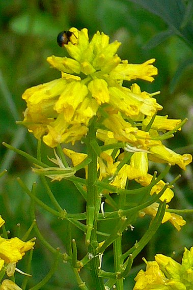 枝先に鮮黄色の4弁花を総状に付ける。花柱は子房と同長で2.5ミリほど、萼片の先にこぶ状突起がある。果実(長角果)は長さ2〜3センチ。花期は4〜6月。