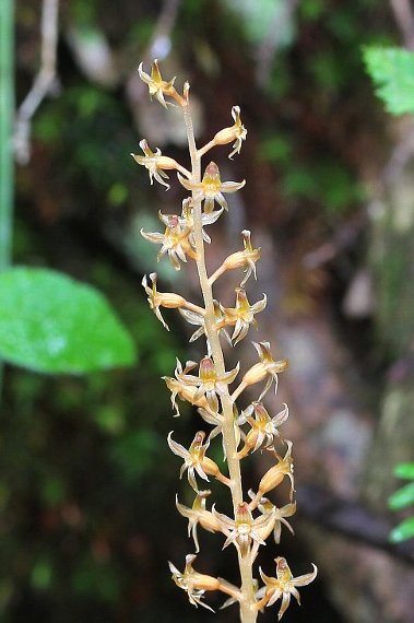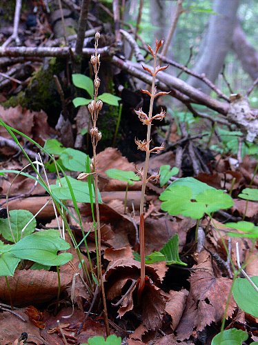 亜高山帯の針葉樹林下に生える無葉緑腐生植物で、高さ10〜20センチ。茎は無毛で、3〜4個の筒状鞘状葉をまばらに付ける。 花は淡褐色で、やや多数まばらに付ける。花期は6〜8月。萼片及び側花弁は卵状広披針形、長さ約3ミリ、開出し、上方は外側に曲がる。唇弁は萼片と同長、三角状卵形、鋭頭。日本では北海道、本州中北部に分布する。 〜徒然想〜 探すのに苦労した花の一つです。八ヶ岳の観察会でこの名を知ってから無性に気になって(そのときは既に実になっていた)、翌年の開花期を楽しみにしていた。 しかし、翌年、出るはずの場所にはなく、またもや無念の八ヶ岳になってしまった。 そこに入った朗報。富士にもあるという情報を得て、翌週、再び中央道に乗る。しかし、ここでも甘くなかった。 朝から富士を探し回ったが見つからない。半ばうなだれて富士を下ることになってしまった。それが幸いしたか、うなだれた先に不意に飛び込んだ一本のそれらしき花。一つ見つかると、いくつも花が飛び込んできます。涙が出るほどうれしくなりました。 いつの間にか夕暮れが近く、林は暗くなってきていた。慎重に、慎重に撮りました。 −同じ科の植物− |