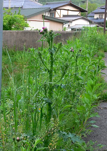 | 道端や土手、あぜ道などに生える越年草で、高さ1メートル内外になる。葉が茎に沿下して翼となり、翼には刺がある。葉は羽状に中〜深裂し、鋸歯の先は刺となり、裏面ははじめ白いくも毛がある。 頭花の総苞は鐘形、花冠は紅紫色で、まれに白色。花期は5〜7月。 大陸からの帰化植物とみられる。 〜徒然想〜 アザミの仲間の同定は難しいが、このアザミは容易。特徴のあるトゲトゲしい姿に出逢えばすぐに分かると思いながらも、なかなかその機会がなかった。 偶然の出逢えたのはシダの観察地の田圃のあぜ道。図鑑どおりの姿で、すぐに分かりました。 トゲトゲしいけれども葉や茎は若草色で、思っていたよりも柔らかい感じでした。 さて、また何処かで出逢えるでしょうが、どんな想いになるか、楽しみです。 −同じ科の植物− |