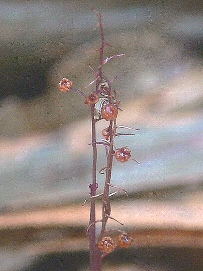 | 暗い林の落ち葉の間に生える腐生植物で、高さは3〜13センチ。茎は細く、葉は鱗片状で、両者とも紫褐色。 総状花序に4〜15個の雄花と雌花を付ける。花被は紫紅色。 〜徒然想〜 とにかく、小さく、細く、目立たない。高さは5センチほどで、花茎は糸のようです。色は赤褐色で、湿った落ち葉で敷き詰められた暗い林の中に紛れていました。 ここにあると指さされなければ、とても見えないでしょう。 視点を下げ、ルリシャクジョウを撮影しているときにみつけました。 この日は、ルリシャクジョウが主役で、いい個体を探す余裕がありませんでした。 後で画像を確認すると、花は終わりかけのようです。色もあせていて、赤褐色ではありませんでした。 いずれ撮り直したいですが、機会があるかどうか・・・。 −同じ科の植物− |