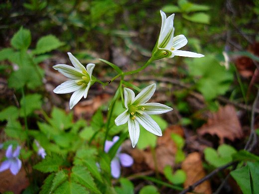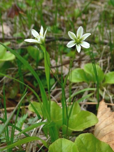 | 山地の草原に生える多年草で、花期は5〜6月。花茎の高さ10〜25センチで細く、ひろっとしている。 茎の先端で分枝し、白花を1〜5個つける。花被片は長楕円形で長さ1〜1.5センチで、腺体がない。 花被片に腺体があるチシマアマナの仲間です。 〜徒然想〜 山の案内人が、“ここにアマナがあるよ!”と指を指します。見ると、ひょろっと、頼りなげなアマナがそこにありました。 縁なく、自生のアマナには出逢ったことがないので(2006年現在)、勇んで写真を撮ります。しかし、考えてみると今は5月も末。いくら八ヶ岳でも、アマナの花期には遅いでしょう。 案内人のいうアマナはホソバノアマナでした。 タデスミレなど、すみれ類が多いこの林道はホソバノアマナもよくみられました。林の縁にたおやかに立ち上がる姿に、沖縄など、遠方からの花仲間が感嘆の声を挙げていました。 −同じ科の植物− |