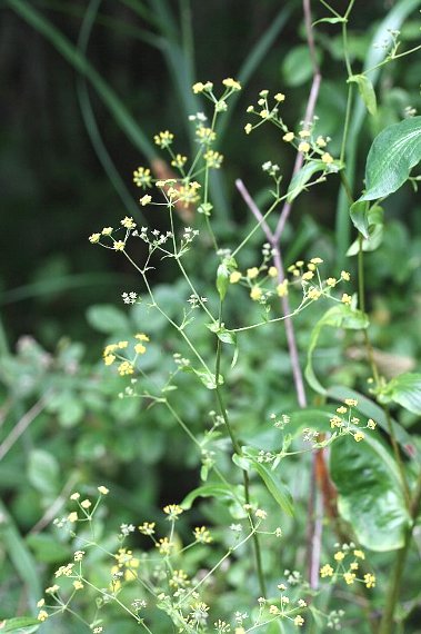 | 山地の陽当たりのよい草地や林に生える多年草で、高さ1〜1.5メートル。茎は上部で分枝する。根生葉は長い柄があり、長楕円形。茎葉は互生し、広披針形で全縁、長さ5〜15センチ。基部は茎を抱く。 枝先や葉腋から複散形花序を出し、黄色い小さな花を多数付ける。花期は7〜9月。北海道〜九州に分布する。 〜徒然想〜 急斜面の登山道が続きます。しかし、両側はずっと花畑です。花がなければ、とてもこの斜面は登りきれないでしょう。一歩上に行けば新しい花に出逢えるから、足が進みます。 図鑑でみて記憶にある花が現れました。ホタルサイコだ! 花火のように弾けて、黄色い花が咲いています。 この花がセリ科とは、驚きます。一般に、セリ科の花は白なのに、この花は黄色です。葉の切れ込みもありません。 −同じ科の植物− |