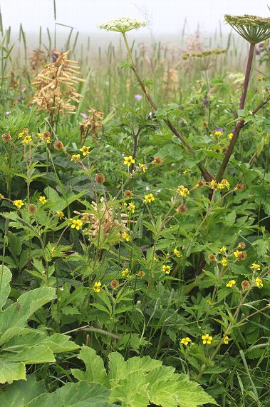低地〜山地の林縁などに生る多年草で、高さは30〜80センチ。全体に黄褐色の粗い毛がある。根生葉は奇数羽状複葉で、頂小葉は丸い。茎葉は単葉で、3浅〜中裂し、縁には粗い鋸歯がある。 枝先に直径2センチほどの黄色の花を数個つける。花弁、蕚片はそれぞれ5個。集合果は球形で、残存花柱に腺毛がある。花期は5〜6月。北海道、本州中部地方以北に分布する。 〜徒然想〜 栂池自然園の入り口付近に咲いていました。ダイコンソウの仲間と思いましたが、今までみたものと少し違うようです。 図鑑でカラフトダイコンソウの名に当たり、これに納得しました。 背の高さ70センチ前後、茎に剛毛が生え、茎葉が大きかったです。花の直径は1.5センチほどでした。 後にオオダイコンソウを見る機会がありましたが、こちらの頂小葉は菱形卵形で、縁には鋸歯があり先は尖ります。拓葉は大きく鋸歯があります。 従って、北海道で撮影した画像はオオダイコンソウの誤りでした。別の画像で、拓葉も確認しました。 −同じ科の植物− |