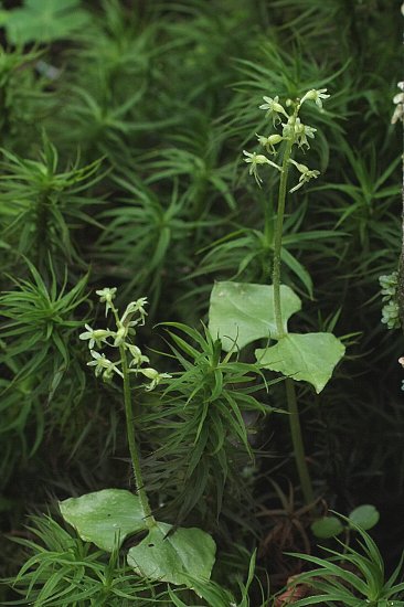 亜高山帯の針葉樹林下などに生える多年草で、高さは10〜20センチ。茎の頂部で2枚の葉を広げ対生する。 さらにそこから花茎(花梗)を伸ばして、総状に4〜10個の花を付ける。花は淡緑色で、子房は膨らんだ楕円形、5本の筋があり、その先に花弁を開く。花期は6〜8月。北海道、本州中北部、四国に分布する。 〜徒然想〜 さあー! この辺からは何かありそうな気がする。花探しで、最近は、そんな感が働くようになってきています。 一層歩を緩めると、とうとうずっと前に追い越した年輩のご夫婦にも追い越されました。 コフタバランは林床の上に葉を広げ、5センチほどの花茎をのばしていました。ごく小さな花だったので、歩を緩めなければ、とても見えなかったでしょう。感の冴えを自賛しました。 とはいえ、写真では花の姿がとらえられていません。また、少し花期から遅れたようです。撮り直しです(2006年)。 その後、この植物との出逢いは多く、2009年の八ヶ岳では最高の花に巡り会えました。花付きがよく、満開状態です。今までの失敗を繰り返さないよう、慎重に撮ったのですが、出来はどうでしょうか。 −同じ科の植物− |