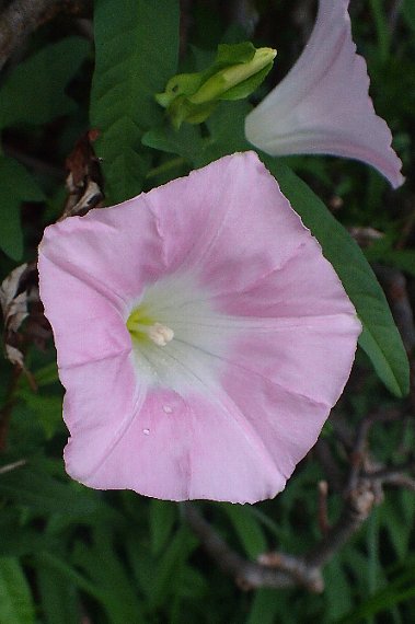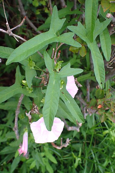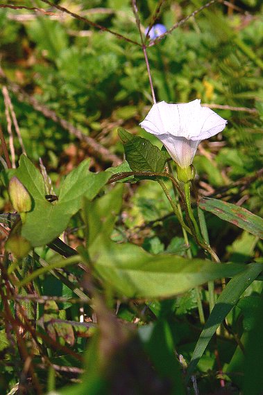 野原や道端に生える多年草で、他の植物などに巻きついてのびる。葉は葉柄があり、三角状ほこ形で、側裂片は浅く2裂する。 花冠は淡紅白色で、長さ3〜3.5センチ、直径3〜4センチ、花柄は長さ2〜5センチ。花柄の上部には縮れた狭い翼がある。花期は6〜8月。本州以南に分布する。 〜徒然想〜 12月ともなると関東近辺の山にはほとんど花がなくなり、寂しい想いになります。 そんなときでも、陽射しのあるときは近くの河原などに出かけます。あてはありません。 いつもよりなお一層ゆったりと歩を進めると、思いがけない花に出逢えることがあります。このコヒルガオもその一つでした。花期はふつう6〜8月ですが、陽当たりのいい河原に1輪だけ花開いていました。 早春に咲くホトケノザも冬場に返り咲くことが多いです。 ヒルガオとコヒルガオ、その交雑種といわれるアイノコヒルガオの違いを調べてみました。 コヒルガオは、花が小さめで五角形、苞はやや短く先端が尖る、花柄には波打った明確な翼があるなどが特徴です。 −同じ科の植物− |