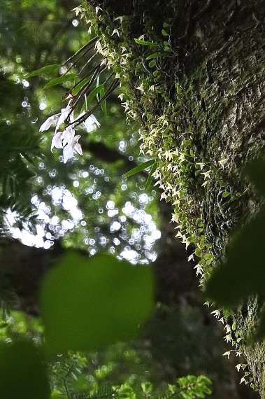 山地の樹幹や岩面に着生し、根茎は細長く匍匐する。葉は倒卵形で円頭、革質。 花は淡黄色で、側花弁は長楕円形で、唇弁は広披針形で萼片より短く、淡紅紫色を帯びる。花期は4〜6月。本州関東以西から沖縄に分布する。 〜徒然想〜 マメヅタランが綺麗に咲いてたとの情報が夕食時に話題になり楽しみになりました。でも、生憎朝から雨が降り出し、うまく撮れるか不安の中現地に向かいます。 マメヅタランの花は、目の上1メートルほどの高みに数多く咲いてました。満開状態で、綺麗です。ときに、雨に濡れ輝く花も見られます。 しかし、撮影には難しい位置です。上から落ちる雨を避けながら、レンズを上に向けての撮影です。手持ちでは暗がりでピンボケです。 カメラに撮れない綺麗な姿は、目に焼け付けます。 千葉県では、びっしりと、すき間なく着いている場所があります。セッコクと並んで着いている場所も見られます。 でも、高いです。あまりにも高いです −同じ科の植物− |