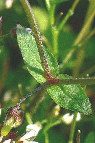 山野の草地、土手、田畑の縁、道端などに生える2年草で、高さは15〜30センチ。茎は下部から分枝して斜上し、茎は普通暗紫色を帯び、密に短毛があり、上部には腺毛も混じる。葉は対生し、卵形〜長楕円状披針形、先は円頭〜鈍頭、両面に毛がある。葉柄は無い。