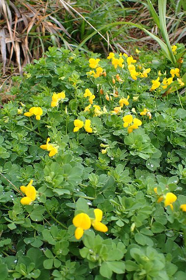 後日、伊豆の海岸でセイヨウミヤコグサと思われる一群を撮影しました。確かに茎や萼片に毛があるようにも見え、これが相当するのか、まだ確認が取れていません。