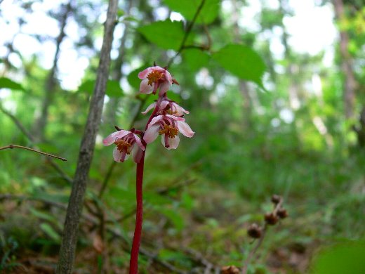 驚いたことに、ネットで検索するとムヨウイチヤクソウの名は、ほとんどヒットしません。イチヤクソウに詳しい観察会の同行者に言わせれば、長い間名前が付けられず、「名無し」と呼ばれていた経緯があるという。 ジンヨウイチヤクソウが咲き誇る7月初旬は、高さ7,8センチほどでまだ硬い蕾、葉は無ありません。7月後半であっても、ようやく少し花開く1株だけを見つけることができました。 開花を確認したくて、再度八ヶ岳に向かいます。今度は、そのほとんどが見事に開花していてくれました。 ベニバナイチヤクソウに似ています。高さは10センチほどのものもありますが、25センチほどに成長しているものもあります。平均20センチというところでしょうか。 茎は紫褐色、花は暗い紅紫。ベニバナイチヤクソウよりも花の数は少ないです。 開花している株の多くは無葉ですが、一部葉が展開しているものがあります。葉は広卵形、長めの柄があります。葉は光沢があり、葉脈に沿って斑があります。 なお、写真の植物がムヨウイチヤクソウであると確認はされていない。さらに、確認のための資料を探したい。 後になって知ったことですが、ヒトツバイチヤクソウがこれに相当するようです。 −同じ科の植物− |
