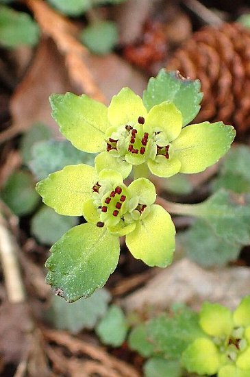 ヨゴレネコノメと同じくイワボタンを母種とする高さ5〜15センチの多年草。ふつう根出葉は花時にはなく、花後に30センチにも達する走出枝を出す。 萼片は淡黄色で花期にはほぼ平開し、雄しべは8個。開裂直前の葯は暗紅紫色。花期は4〜5月。東北地方南部〜中部地方の太平洋側に分布する。 〜徒然想〜 ヨゴレネコノメとの違いがよく分からなくて、アップを先延ばしにしていました。図鑑などには、萼片が平開する、葯が4〜8個で暗紅紫色などの特徴が示されています。 しかし、萼片がまだ平開しきれていない初期のものがあったりすると、即、迷いになってしまいます。 少し救われつつあるのは、数を見ることによって、典型的なものと、そうでないものとを見分ける目が、多少なりとも出来てきたことでしょうか。植物によって、見なければならない部分が分かってきたことでしょうか。 違いは、ヨゴレネコノメの萼片はほぼ直立し、葯は暗紅色、花糸、花柱及び子房が紅紫色を帯びることを、指標にしています。 母種のイワボタンの葯は黄色です。 −同じ科の植物− |