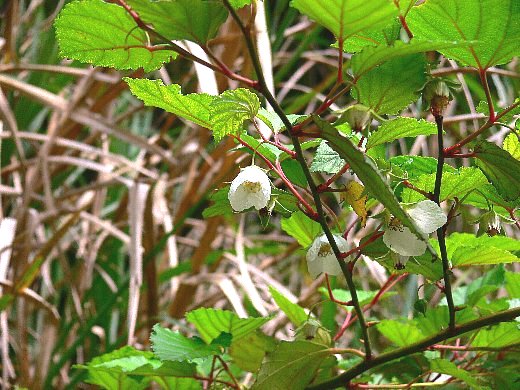 別名シマアワイチゴ。低地〜山地日当たりのよい林縁に生える落葉低木で、斜上し高さ2メートルほどになる。出逢ったのは1メートルほど。葉は互生し、長さ1〜3センチの葉柄があり、葉身は卵形〜卵状楕円形で、低い鋸歯がある。質はやや厚く、脈や葉柄が赤みを帯びるものと帯びないものがある。 短い花枝の先端に下向きの白い花を1、2個つける。集合果は直径約1.3センチの球形で5〜6月に橙黄色に熟し、美味しい。 〜徒然想〜 森に入ってまもなく、ヒカゲヘゴを見るために車を止めます。橋の眼下には見事なヒカゲヘゴが葉を広げ、渓流を覆っています。まるで違う世界に迷い込んだようです。あの下にはどんな植物が潜んでいるのだろうか。想像すると、わくわくします。 リュウキュウイチゴは車を止めた林道脇に枝を垂らしていました。 初めての沖縄訪問は、わくわくに満ちています。次から次に現れる花は未見のものばかりで、1つを撮りながら、横目で次の花に見る始末です。 −同じ科の植物− |