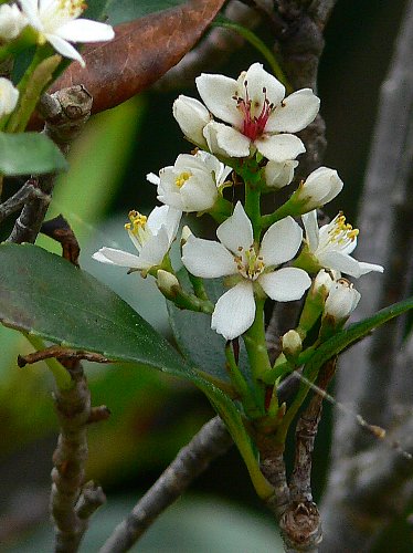 沖縄の地では、今はシャリンバイが盛り。波が打ち寄せる海岸を見下ろす高台で、リユウキュウシロスミレが咲く道路脇で、・・・と、観察地の随所で見られた。 三浦半島ではわずかに花を残すだけだったので、次の年を楽しみにしていた。予測もしていなかった沖縄での出逢いに、何枚もシャッターを押した。 暖地の海岸崖地〜やや内陸などに生える常緑低木〜小高木で、6メートルほどにもなる。葉は暗緑色で厚く光沢があり、縁は鈍鋸歯又は全縁。枝先に密に互生するが車輪状にみえる。 花は白色で、芳香がある5弁花。実は球形で黒紫色に熟す。 樹皮や材はタンニンを多く含み、奄美大島の特産品である大島紬の染色に使用されることで知られている。 和名は、枝の分岐する様子が車輪状で、梅の花に似ることによる。 |