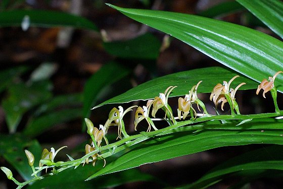 | 常緑広葉樹林内の岩上又は樹上に着生する多年草。葉は狭長楕円形で、鋭尖頭。 花は淡黄緑で、3〜15花が一方に偏った総状に付く。側花弁は線形で、唇弁はくさび状倒卵形。子房がねじれないので、唇弁は上向きに付く。 〜徒然想〜 もうすぐ出逢える・・・・・!! 9月に確認した株が、今を盛りに花を咲かせているという。見覚えのある道を奥に進むにつれ、どんな姿で花を咲かせているのか、ワクワク!ドキドキ!次第に胸が高まります。 出逢いはもちろん感動的です。20センチほどの太さの幹に花茎を横にのばし、小さな花を付けています。まるで、かわいい虫たちが枝に並んでいるようです。 関東方面の花がほぼ終わって1ヶ月あまり。機会があり沖縄に渡りましたが、そこにはすばらしい花たちと沖縄の方々の温かい心がありました。2007年の締めくくりに相応しい。 そして、新しい年がはじまります。 −同じ科の植物− |