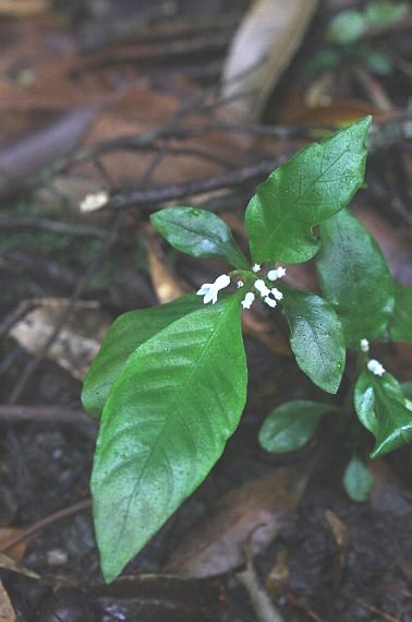 | 林のやや湿ったところに生える多年草で、高さ5〜15センチ。茎5〜8個の柄の無い花を付ける。 花冠は白色で漏斗形、長さ3〜5ミリ。花期は12〜5月。屋久島〜琉球に分布する。 〜徒然想〜 往きの飛行機の中で図鑑をながめ、この名を記憶していました。 葉の基部に、ちょこんと1センチにも満たない小さな花を付けていました。ロート状の白い小さな花です。なるほど、チャボイナモリですか。当を得た名前です。 図鑑をながめ想像していたとおりの花が、想像したとおりの場所にある。これもうれしいものです。 8年ぶりの対面です。高速道路が一律1000円という時期があり、本州に観察地を求め続けたことがあります。その間は南の島への訪問は中断していました。 南の島への訪問を再開し、久しぶりの花に出逢う〜こんちには!〜という想いです。 -同じ科の植物- |