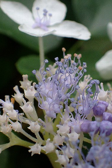 | 山地の湿った沢筋などに生える落葉低木で、高さは2メートルほどになる。葉は対生し、長い柄があって長楕円形〜倒卵形、先は尖り、両面に毛があってざらつく。 枝先に散房花序を広げる。蕾は花序全体が総苞に包まれて球状となる。中心部の両生花は淡紫色で、花弁や萼片は4〜5個。花は咲くとすぐに散り始めてしまう。周囲の装飾花は直径20〜30ミリ。花期は7〜9月。本州宮城県〜岐阜県の主に太平洋側に分布する。 〜徒然想〜 丸い玉がポンと弾けるように、大きく花を開きます。葉の上には、まだ弾けた総苞が残っています。あの丸い玉の中に、どのようにして大きな花が収まっているのか、不思議に想います。 どちらかというと、暗い湿った登山道で出逢うことが多く、そんな中でも、この花はうす紫色の花を、ときに色濃く浮かび上がらせます。 −同じ科の植物− | |