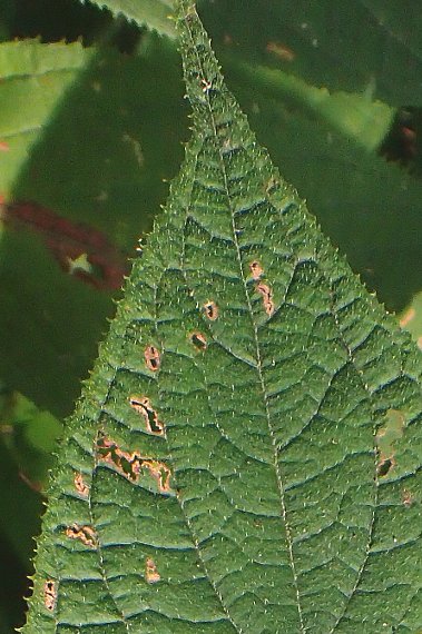 | 葉は楕円形で先が鋭く尖り、縁には細かい鋸歯があります 両面に硬い毛がありザラザラします | ||