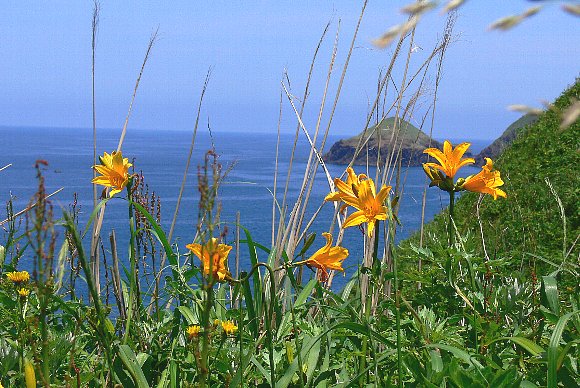 | 山形県酒田市飛島。酒田市の北西方向39kmに浮かぶ周囲10.2kmの自然豊かな小さな島である。 トビシマカンゾウは、この島と佐渡に自生する。 ニッコウキスゲの島しょ型変種といわれている。違いは、背丈が高く1メートルを超え、花数をより多く付け、花色のオレンジ色が強いとされている。花期は5〜6月。 〜徒然想〜 やはり自然においた花はいい。青い空に青い海、色鮮やかに映えるトビシマカンゾウです。 思い描いたとおりの景色が目の前にあります。何とも心地よく、大きく背伸びしながら、観察地をゆっくり歩きます。 この風情が撮りたくて佐渡の地に来ました。望みが果たせて、満足、満足! そういえば、池波正太郎の時代小説に、「まんぞく まんぞく」というのがあった。関係ない連想でした。 −同じ科の植物− |