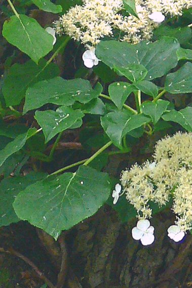 山地に生える落葉ツル性樹木。他の木や岩に絡まって伸び、高さ20メートルに達する。葉は対生し、卵形〜円形、浅いハート形と変化が多く、細かい鋸歯が整然と並ぶ。 両性花は黄白色で、装飾花3〜7個が両性花を囲む。装飾花の萼片は3〜4個で白色。花期は6〜7月。北海道〜九州に分布する。 〜徒然想〜 箱根ガラスの森美術館に、初めて訪れました。カラス玉で作られた木が、陽にきらめいて美しいです。 園内の建物に緑のツル性植物が絡まっていました。その中に白い花が混っています。 八ヶ岳では、4、5メートルほどの高みにこの花が咲いていました。逆光で花が見えにくかったですが、こんなにも長くツルを伸ばすことを知りました。 さすがに北海道は何もかもが壮大です。沢を隔てた森の壁にツルアジサイがぶら下がっています。その距離20メートルほど、10メートルほどの高みにあります。森が暗いだけに、白く浮き出て、まるで滝のようです。 道を戻ると、今度は太さ50センチほどの大木を覆うように絡みついています。枝先はどこまで続いているのだろうか、ずーっと上を見上げます。 −同じ科の植物− |