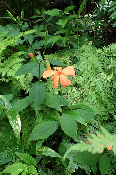 山林の日陰で出逢うことが多く、花色もぼやけた朱色で、なかなか鮮明な写真が撮れません。