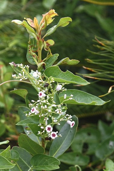 花は葉腋から短い集散花序を出し、花を付ける。花冠は灰白色、漏斗状で長さ1センチ、直径5ミリほど。先は浅く5裂して平開する。喉部と内側は赤紫色。果実は核果で直径5ミリほどの球形、先端に萼の裂片が残る。花期は8〜9月。日本全土に分布する。