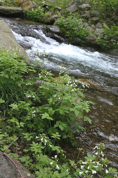 花は茎の上部に総状花序に十数個付き、花弁は長卵形で白色、長さ8ミリほど。果実は線形で、長さ2〜3センチ、無毛。花期は5〜6月。中部地方以北に分布する。