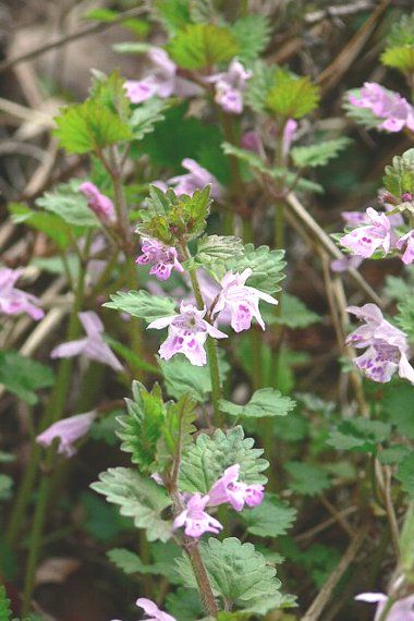 山野の草地、道端などに生える多年草で、高さは5〜25センチ。茎は初め直立し、花後倒伏してつる状になって伸び、節から根を出して増える。葉は対生し、腎円形、先は円頭で鈍い鋸歯がある。 花は葉腋に1〜3個付き、花冠は長さ2センチほどで淡紅色、唇形花で下唇には紅紫色の斑点がある。花期は4〜5月。北海道〜九州に分布する。 〜徒然想〜 2006年のHP開設当初から収載した花です。以来、いつかは修正しようと思いながらも、ずいぶんと時が経ってしまいました。 なかなか見栄えがする花なのに、何度も出逢いがあるのに、すっかり撮影しなくなってしまったことも反省です。 山野に普通に見られる花で、垣根を通り越して増えるほど繁殖力が強いことからカキドオシの名があります。 最近撮影した画像は、近くの多摩川河川敷で撮ったものです。こんな身近なところにも群生が見られるとは、ちょっと驚きもありました。 ただし、撮影には不満で、次の春に撮り直しです。 −同じ科の植物− |