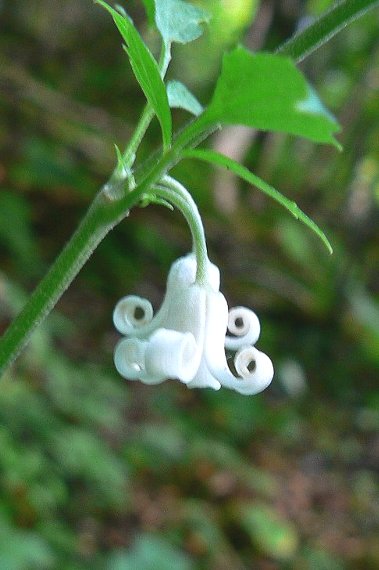 雌雄別株。花は茎の先端や葉腋から集散花序を伸ばし、下向きに淡青紫色の花を多数付ける。花弁状の萼は4個で、外面に絹毛がある。雌花は筒状壷形、長さ1〜2センチ、咲くが反り返って巻く。雄花は壷状で、雌花より小さい。花弁はない。花期は8〜9月。北海道西南部〜本州に分布する。