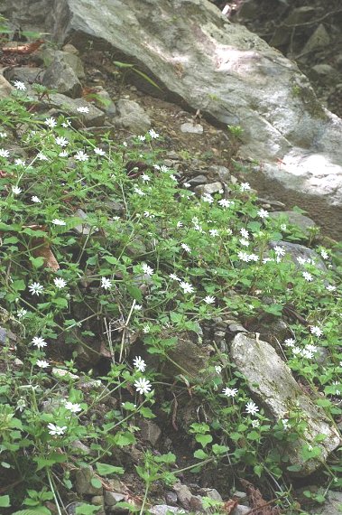 | 山地のやや湿った草地などに生える多年草で、高さは10〜40センチ。茎は叢生し、斜上又は下部は地を這う。葉は対生し、卵形〜心円形、先は鋭頭〜鈍頭、基部と葉柄に長い毛がある。葉柄があり長さ1.5センチほど。 花は上部葉腋から花柄を出し、直径1〜1.5センチほどの白色の花を単生する。花弁は5個で先は2深裂し、10個に見える。雄しべは10個、葯は黄白色。花柱は3個。花期は5〜7月。北海道西南部〜九州に分布する。 〜徒然想〜 春に山散歩していると、林道脇や谷沿いの登山道でふつうに見られます。 白く大きめの花なので、すぐにこれと気付きますが、実はこの仲間はなかなか難しいのです。葉の形や花の大きさ、生息地などで区別します。 よく似ているのがヤマハコベです。ヤマハコベは葉に柄がありませんが、ミヤマハコベには長めの柄があります。 ヤマハコベは近畿以西に分布し見られるのは稀ですが、ミヤマハコベはほぼ日本全土に分布しふつうに見られます。 ただ、広島で撮った画像では、上方の葉に柄がないものも見られました。 −同じ科の植物− |
