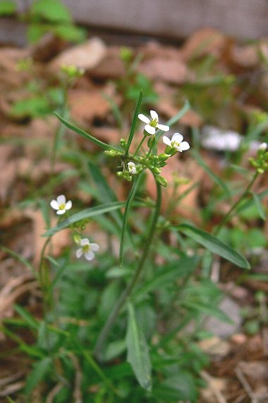 山地から高山の砂礫地や岩場に生え、よく分枝して茎が細く、ひ弱に見える花です。花は小さく4弁、白色で、ロゼット状の根生葉と線形の茎葉をもちます。