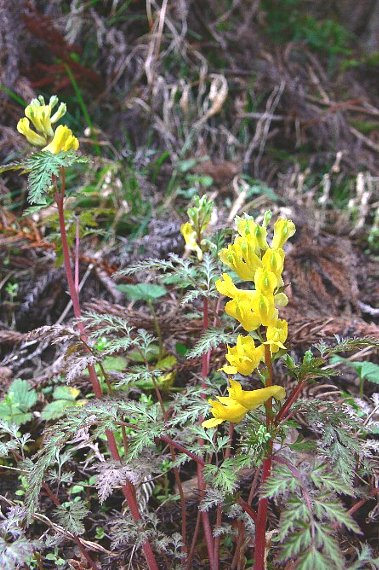 他の地で見られる葉よりも、切れ込みが浅く少なく、花数も少ないのでフウロケマンを思わせます。