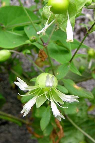山野の草地などに生えるつる性の多年草で、長さは1〜1.5メートル。葉は広披針形〜卵形で、先は鋭尖形、裏面と縁に毛がある。