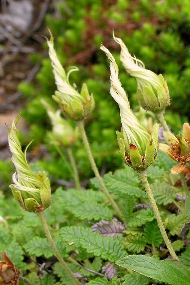 小判型の特徴ある葉で、すぐチョウノスケソウと分かります。白い花が終わって、グリッとねじった穂を付けるのが面白いです。やがてネジリがほどけ、大きく穂を広げます。