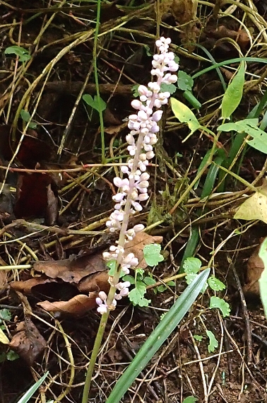 花は円柱形の総状花序に多数付き、花被片は6個、紫色〜淡紅色、浅い漏斗形で長さ5ミリほど。果実は球形で、直径6〜7ミリで、光沢のある黒紫色に熟す。花期は7〜10月。本州〜沖縄県に分布する。
