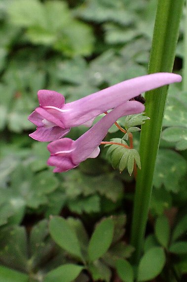 山野の林下などに生える多年草で、高さは10〜20センチ。葉は1〜3回3出複葉。小葉は卵円形〜披針形など変化が多い。 花は茎頂に少数又は多数つき、青紫色で長さ1.5〜2.5センチ。苞は歯牙又は欠刻がある。花期は4〜5月。本州〜九州に分布する。 〜徒然想〜 幅1メートルほどの一面には、若緑の葉がびっしり広がっています。その中にポツンポツンと紫色の花が立ち上がっています。まだ咲き始めなのでしょうが、全部が咲いたら、壮観な姿をみせてくれることでしょう。 苞の先がギザギザなのが特徴で、ジロボウエンゴサクと見分けることができます。 葉の形には変化があります。花の色も淡い色や赤みが強い色など、いろいろあります。 −同じ科の植物−
