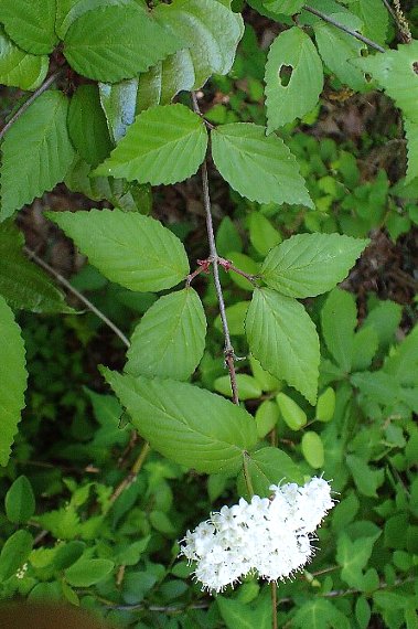 | 山地の林縁などに生える落葉低木で、よく分枝して茂り高さは4メートルほどになる。葉は対生し、卵形〜楕円状披針形、先端は尖り、基部は広いくさび形〜円形、縁には鋭い鋸歯がある。両面に星状毛があり、裏面は主脈に沿って長い絹毛が生える。 枝先に散房花序を出し、白い小さな花を多数付ける。花は直径5ミリほどで、5裂して平開する。雄しべは5個。果実は核果で卵球形、秋に暗赤色に熟す。花期は4〜5月。福島県以西〜九州に分布する。 〜徒然想〜 ガマズミやミヤマガマズミとよく似ています。 違いは、本種はこの仲間としては葉が小型でやや幅が狭いこと、葉柄がごく短いこと、両面に星状毛が密生していることからビロード感の手触りがあることなどが挙げられます。 ガマズミは、葉がやや大きく丸みがあり倒卵形〜卵形で、先が尖ります。花序がびっしりと付く感じで、コバノガマズミは花序が端正で小花が大きく見えます。 ミヤマガマズミは、カマズミの葉に似ますが、葉先がツンと尖ります。葉裏脈上を除き毛が無いか少なく、萼や花冠にも毛がありません。 −同じ科の植物− |