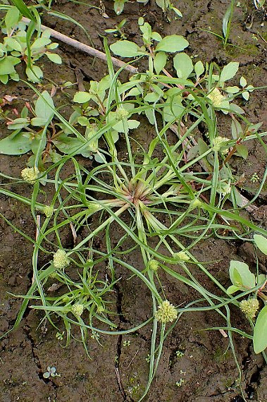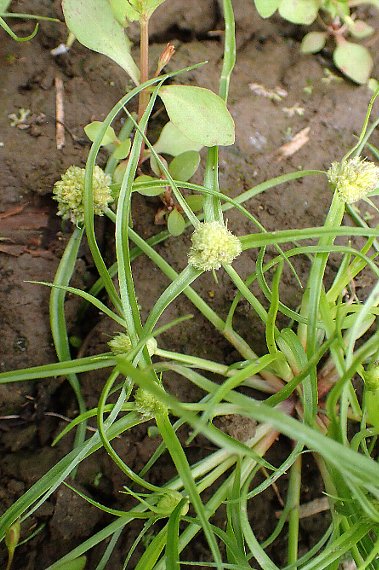 川岸、湖岸などの湿地に生える1年草で、高さは20センチほどになる。叢生し、葉は茎より短く、基部の鞘は赤紫色。苞葉は3〜6個あり、葉状で花序より長い。 花序は集まって丸い頭状となる。小穂は狭卵形、長さ3〜5ミリ、白緑色でやや扁平、2列に鱗片を付ける。鱗片は鋭頭。果実は細い楕円形で、縁に狭く白い翼がある。柱頭はふつう2岐する。花(果)期は7〜11月。北海道、本州に分布する。 〜徒然想〜 カヤツリグサ科らしいのですが、こんな姿のものは初めてです。花序は立ち上がらずに、地べたに貼り付く茎の先端にボール状になって付いています。 ここは、秋になり水嵩が下がった用水路です。 キタミソウを求めて砂泥地を探したのですが、開花したものは見つかりませんでした。でも、オオメナモミ、コイヌガラシなど、何の変哲もない河川敷は賑やかです。 −同じ科の植物− |