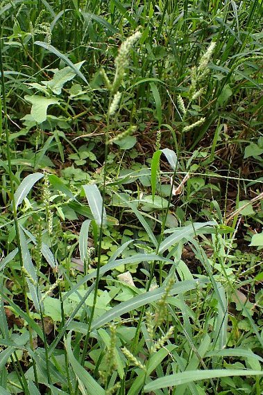 イヌビエの変種。やや乾燥した道端、草地などに生える1年草で、高さは20〜60センチ。全体に小さく、紫色を帯びることが多い。葉は幅5〜10ミリ、葉舌はない。 柄の短い花序枝が疎らに付き、さらに分枝することがないので疎らな花序となる。枝や小穂の基部に数本の長い毛がある。小穂は卵形で長さ2.5〜3ミリ、芒はほとんどなく、第1包類は小さく、鈍三角形。イヌビエと同様に第1小花の護頴は膨らまない。花期は6〜10月。日本全土に分布する。 〜徒然想〜 図鑑等には、イヌビエが湿地などに多いのに対し本種はやや乾いた草地や道端などに生えるとありますが、本画像のものは川と沼地に挟まれた通路に生え、どちらかといえば湿った地であるといえます。乾いた地に限らないということでしょう。 背丈は40〜50センチほどで、膝ぐらいの高さです。花序は小さく、疎らに花序枝が付いています。 本種とイヌビエの違いは全体に小型であることと小穂の形と長さです。 やや枯れて色付いた花序と緑味が残る花序を採取し、小穂の詳細を撮らせてもらい、本種と同定しました。 本種とイヌビエを比較しているうちに、前年に三鷹市の休耕田で撮影したものは本種と思えるようになってきました(当初はヒメイヌビエがあることを知らずイヌビエとしていました)。 −同じ科の植物− |