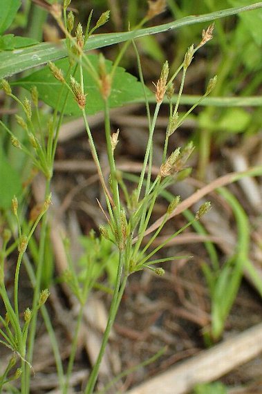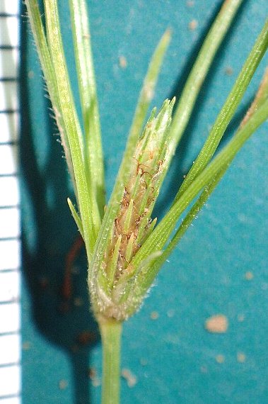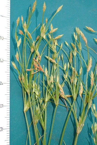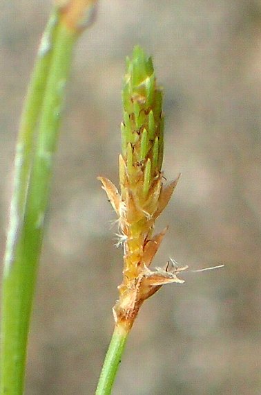 花序は茎の先の苞の間から枝を数個出し、枝はさらに分枝し、先に小穂を1個付ける。苞は葉状で3〜5個。小穂は披針形、長さ4〜7ミリ、鱗片は長楕円形、先は短い芒になり直立する。花柱の基部全体から果体の上半分にかかる下向きの長毛がある。柱頭は2個。花(果)期は8〜10月。北海道〜本州に分布する。